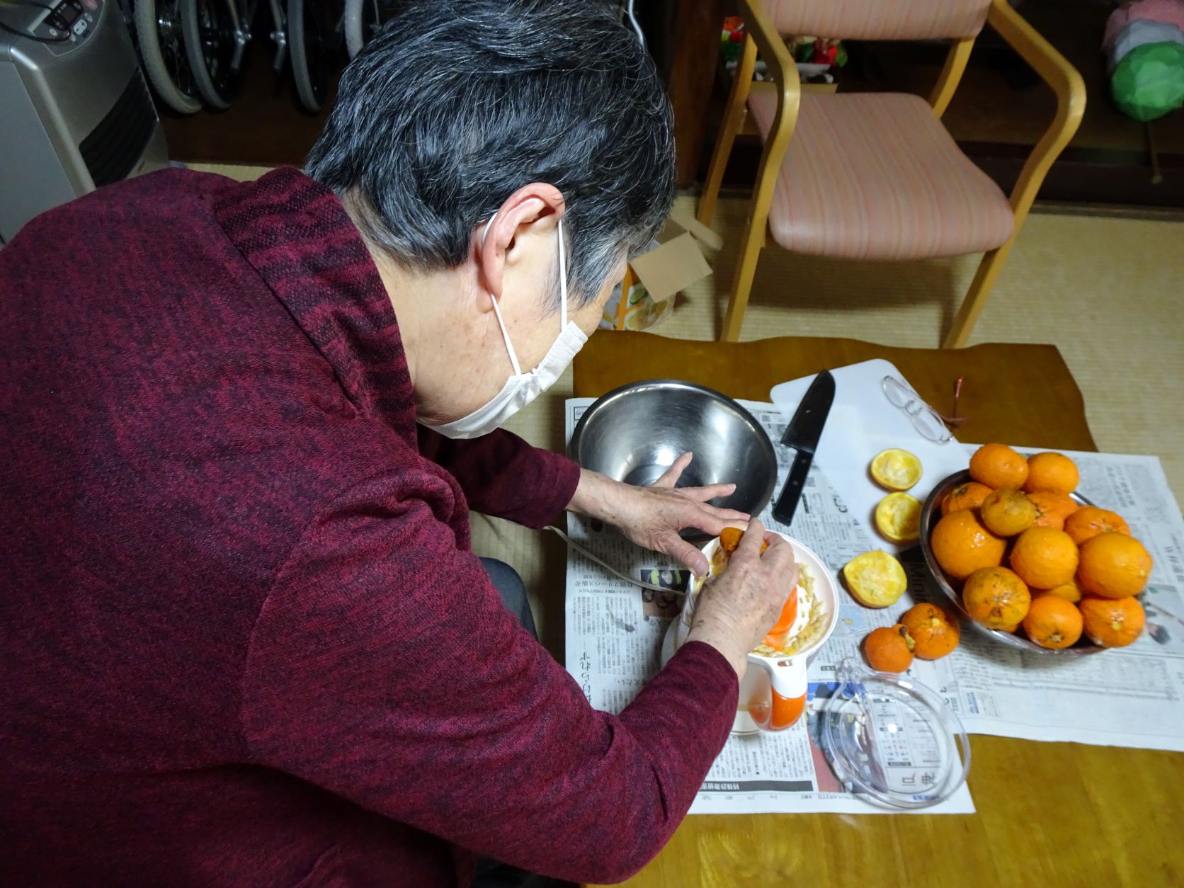 移転したときから裏庭にあった橙(だいだい)の木。皮をむいてそのまま食べると顔がゆがむほど酸っぱいのですが、絞ってポン酢に仕立てると美味しいことこの上ない。今年も水曜日の利用者さんに、シトロンジューサーを使って絞るのをお手伝いいただきました。良い香りが部屋中に漂いました。しばらく熟成させ、夏ごろから昼食にお出しする予定です。