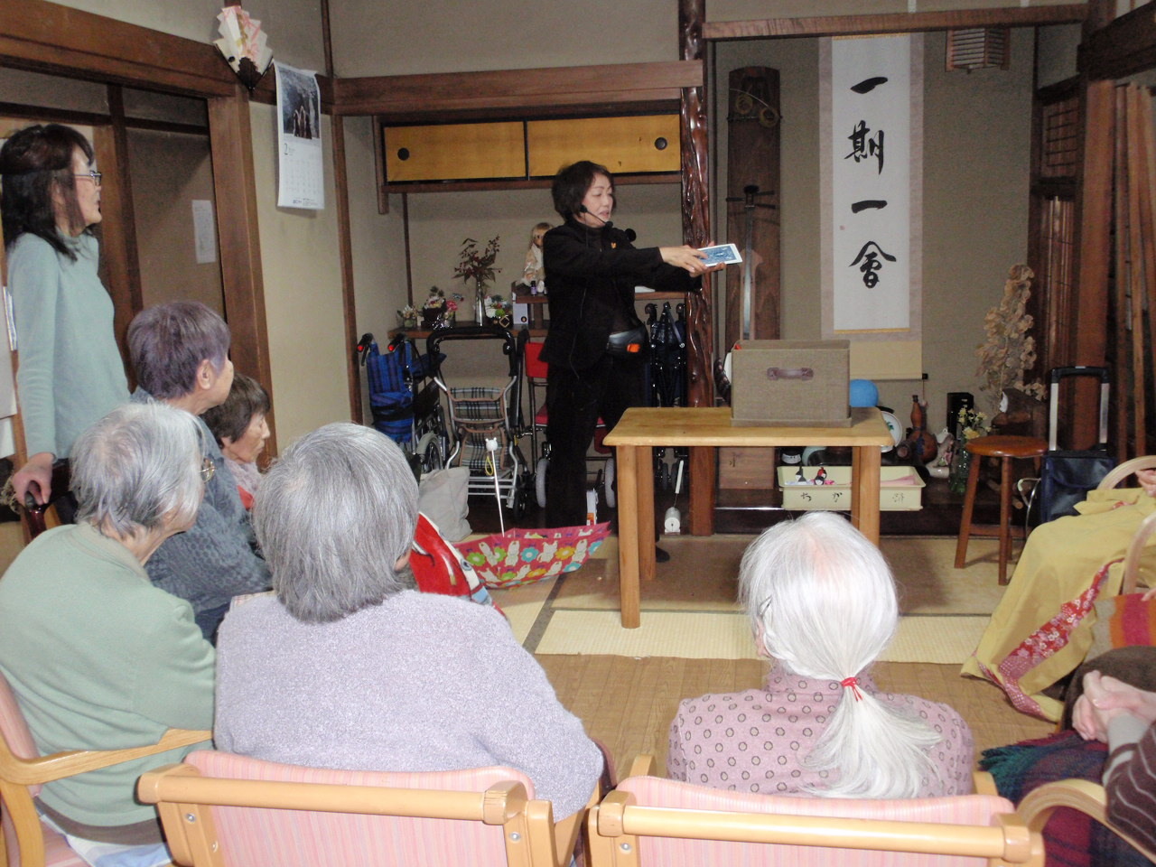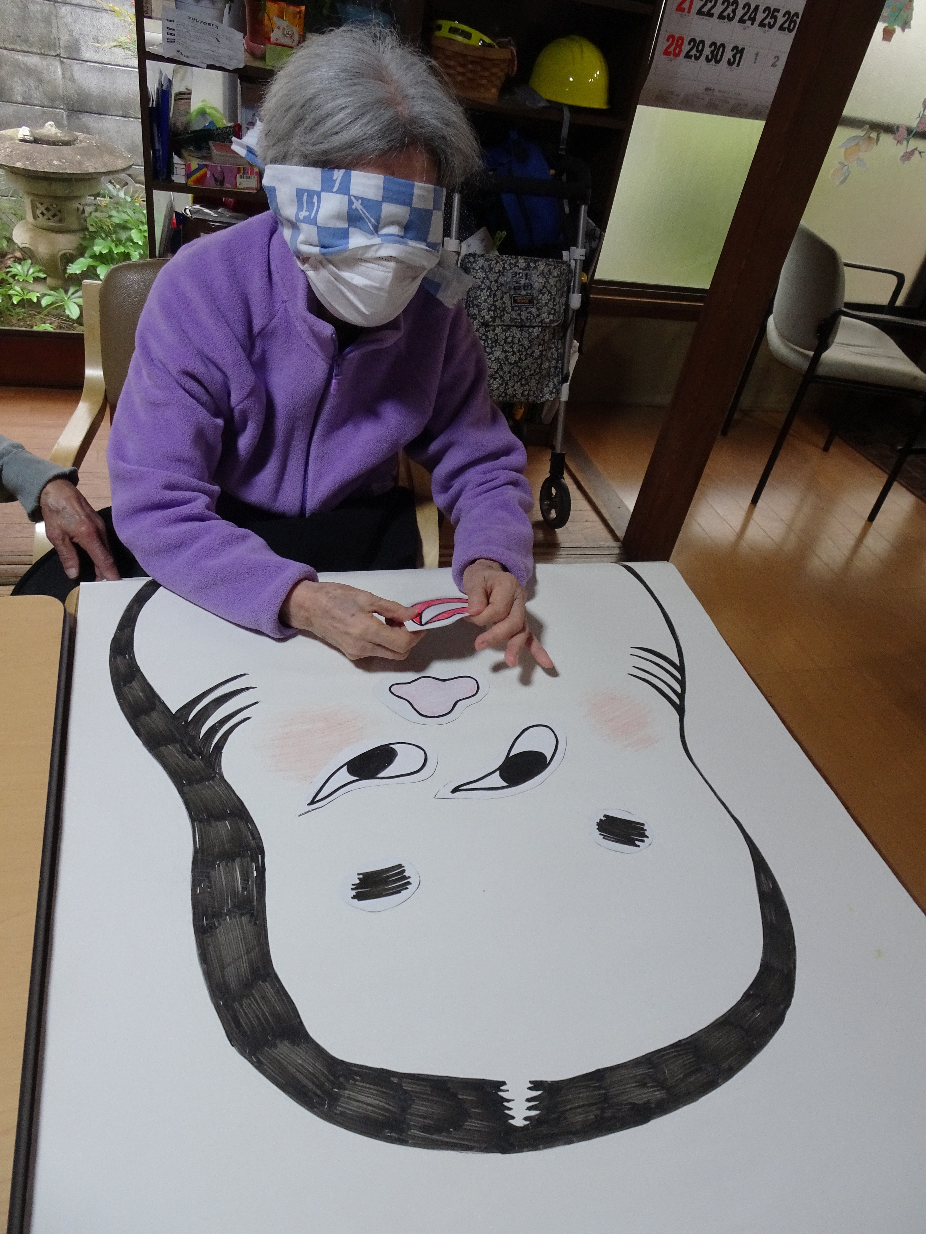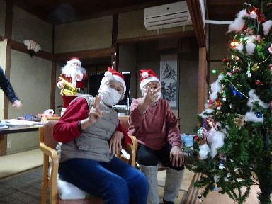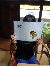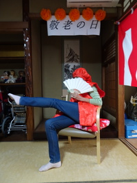 今年の敬老の日は、台風の接近のため臨時休業となってしまいましたが、この週はお祝いのはんてんや帽子をかぶって記念撮影をしました。「綿も入って上等やね。柄に鶴や亀甲模様があって縁起がいいね~。」と話も盛り上がりました。