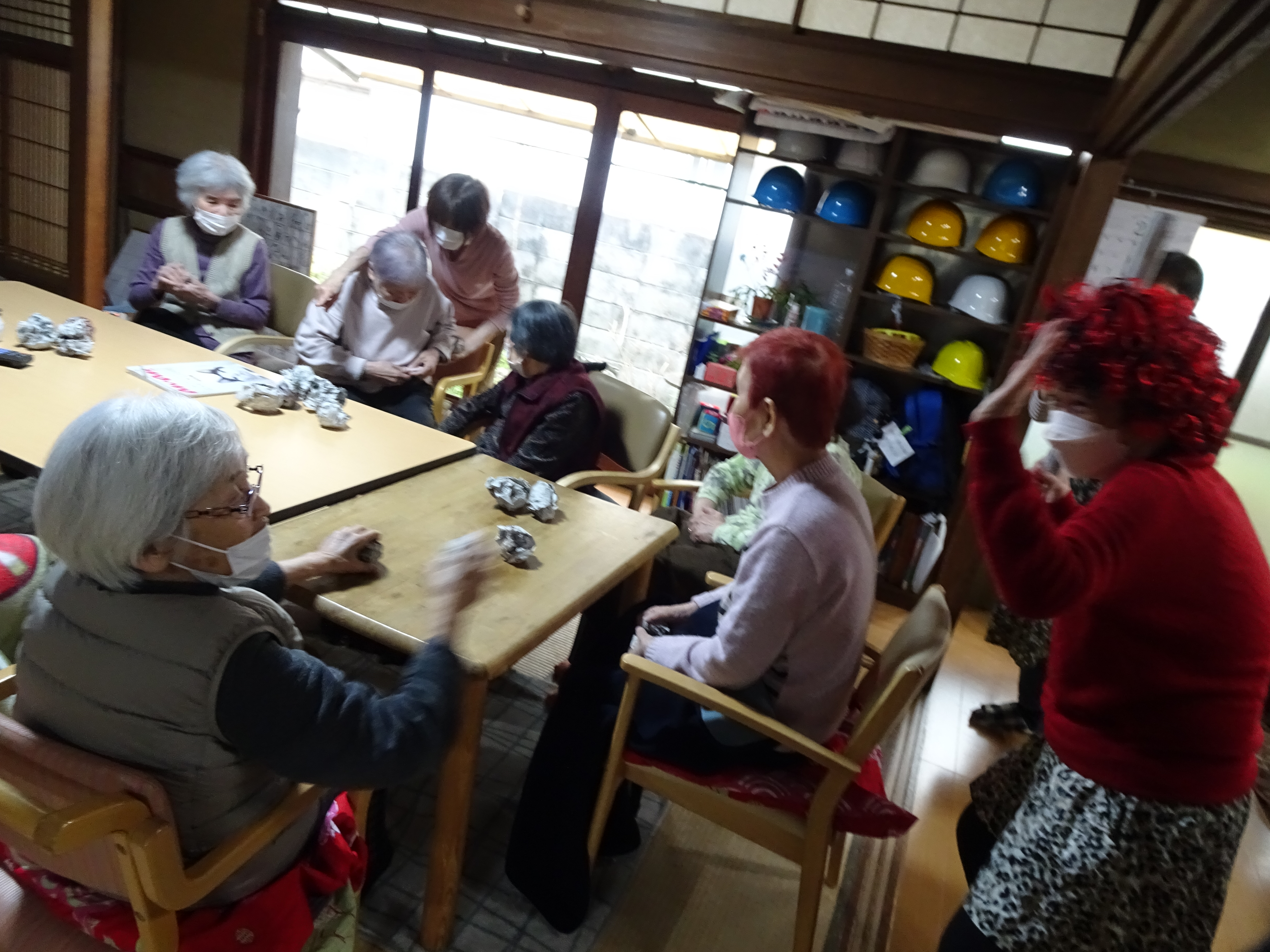 今年も赤鬼さんがやってきました。「鬼は外!!福は内!!」の掛け声とともに豆に見立てた新聞紙で鬼退治をしました。