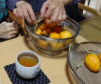 柿をたくさん頂いたので、干し柿作りに挑戦しました。ひとつひとつ丁寧に皮をむいて、ヘタに縄を通して干す準備を手分けして担当しました。